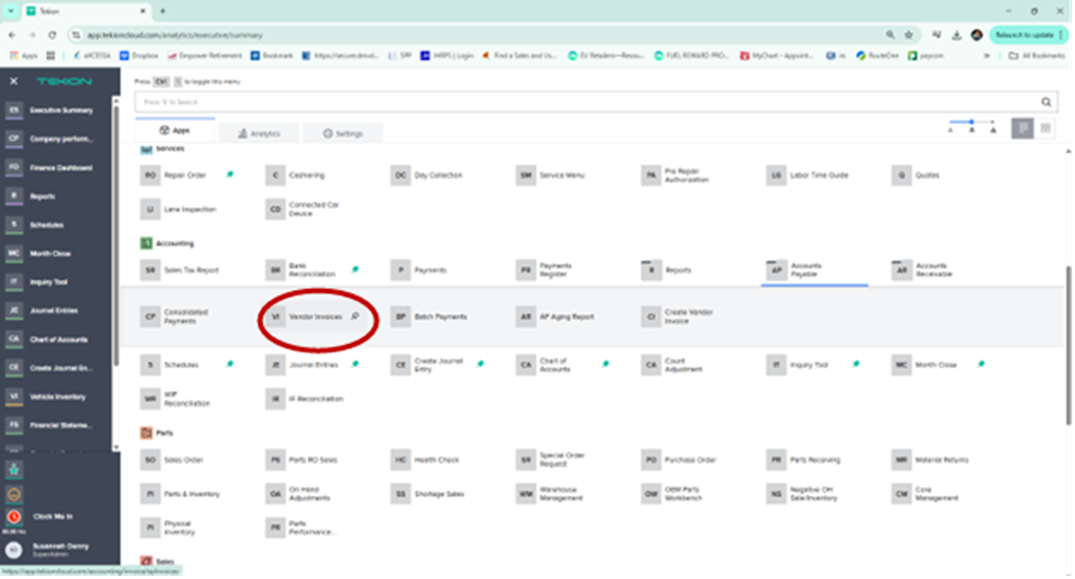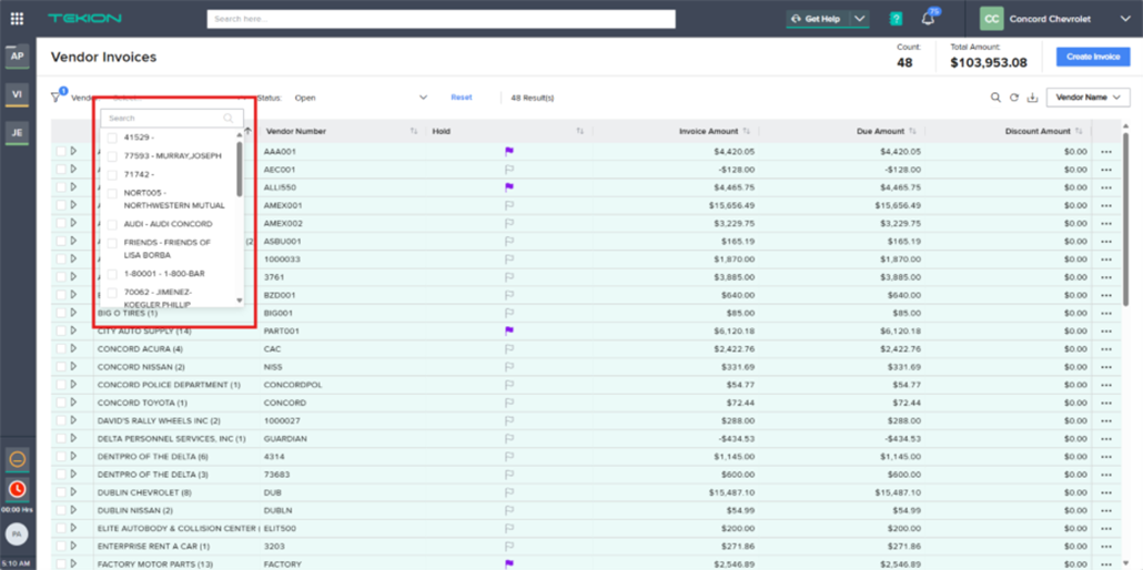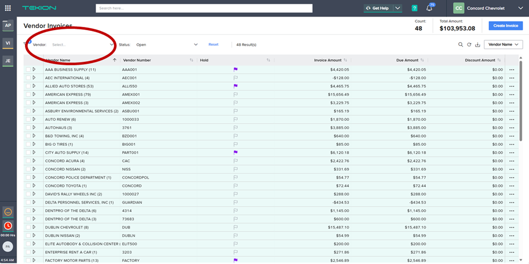 4.3 If you have a statement that is ready to be paid, but there is more posted in Tekion than what’s on the statement, press the drop-down arrow on the vendor name and select the specific invoices you wish to pay.