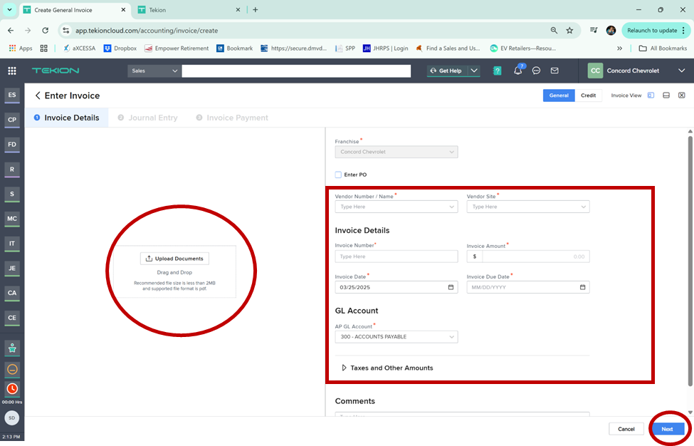 8. Validate Invoice Accuracy - Ensure the uploaded invoice in Tekion is accurate by verifying it against the corresponding PO. Confirm that amounts, vendor details, and all other information match.