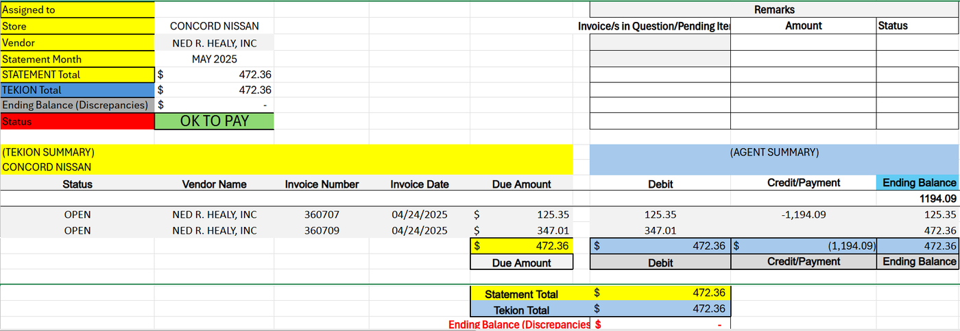 3.2 Once we confirm that the posted invoices match the statement that they’ve sent, we can proceed to payment for us to settle the balance due. Please see screenshot below – OK TO PAY which means the balance are the same “TEKION INV vs STATEMENT”